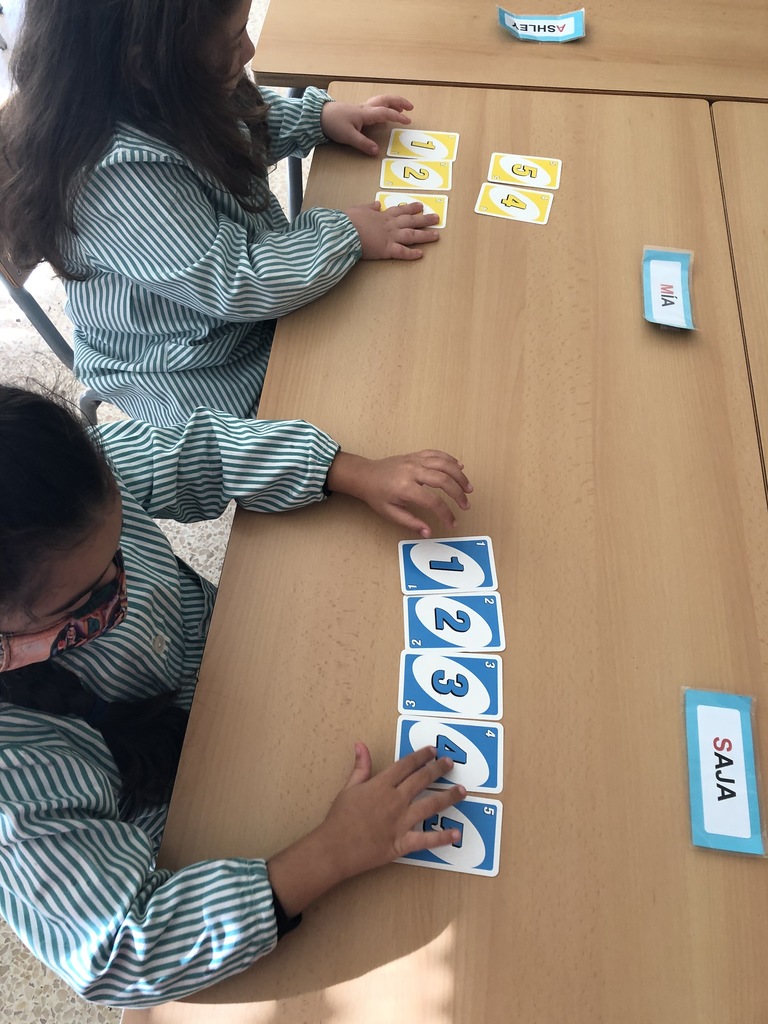 Els nens i les nenes de P5 estem aprenent a relacionar la grafia de cada nombre amb la seva quantitat. Primer hem repartit les cartes amb els nombres de l’1 al 5 desordenades i les hem ordenat. Seguidament hem jugat a fer torres amb el nombre de peces de construcció que indica cada carta. Ens ha agradat molt fer matemàtiques jugant!