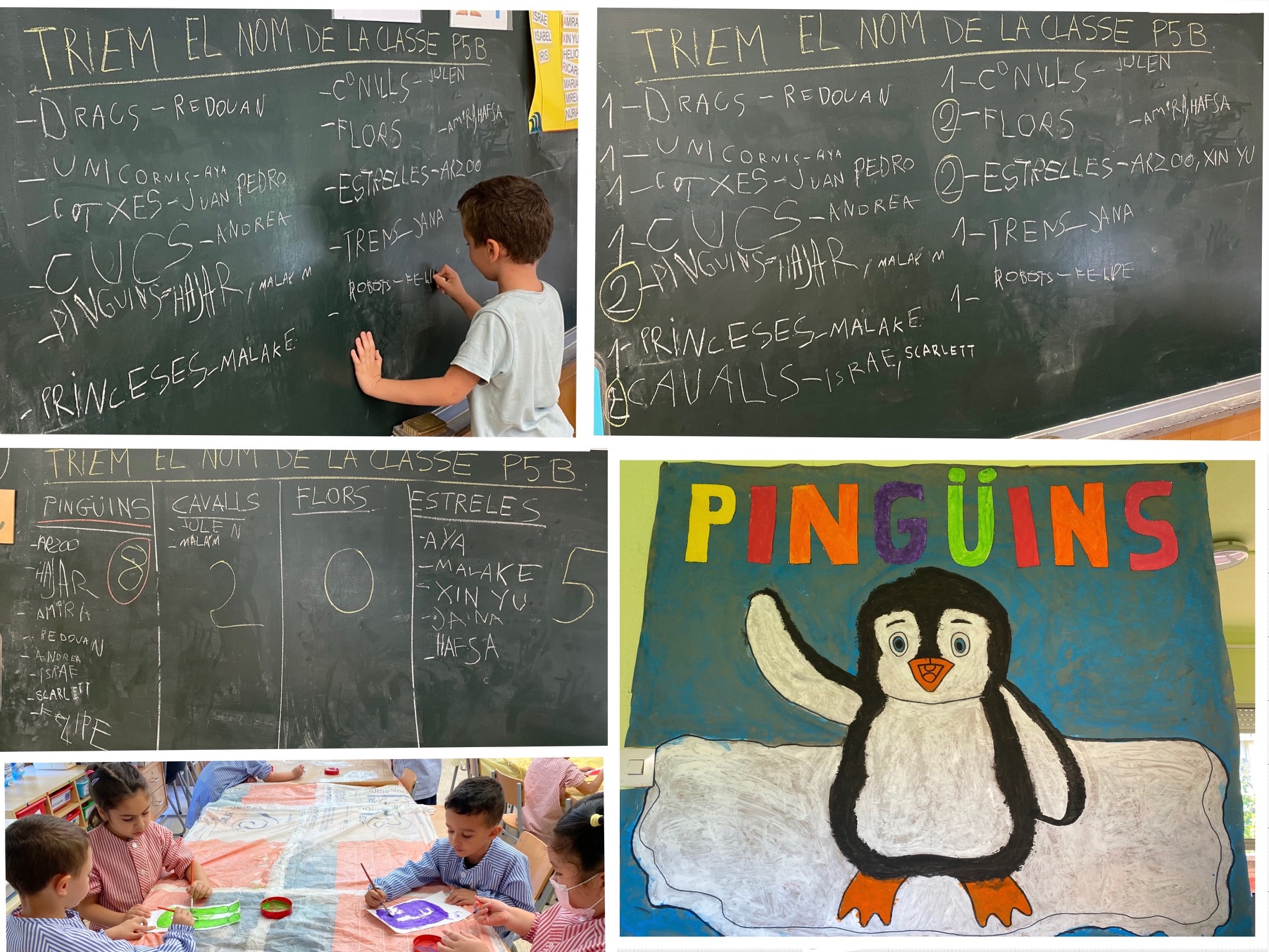 Els infants de P5B, després de conversar sobre quin ens agradaria que fos el nom i el projecte de la classe, vam fer dues votacions i, per majoria de vots, va sortir guanyador: “La classe dels pingüins”.