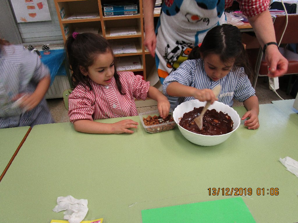 3- A la xocolata blanca desfeta li vam barrejar cereals d’arròs. A la negra li van barrejar ametlles, la classe de les papallones i avellanes la classe dels conills.