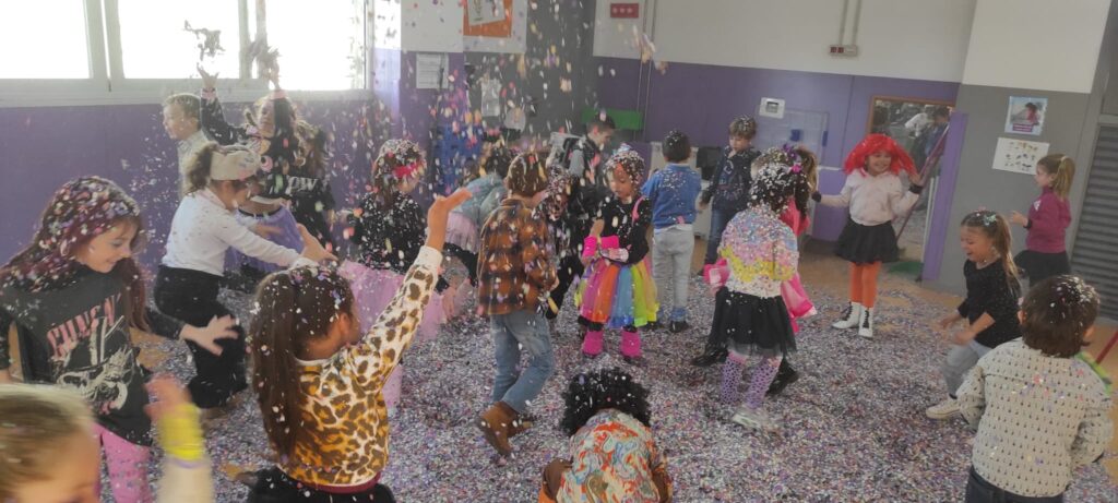 A l’escola fem moltes activitats durant la setmana del carnaval: tallers de màscares, pintura de cara, joc simbòlic a psicomotricitat…però la que més ens agrada és… la festa del confeti!!!