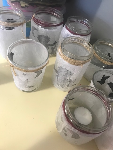 Per la nostra activitat, vam necessitar un pot de vidre, plantilles i una espelma…i mireu el resultat,