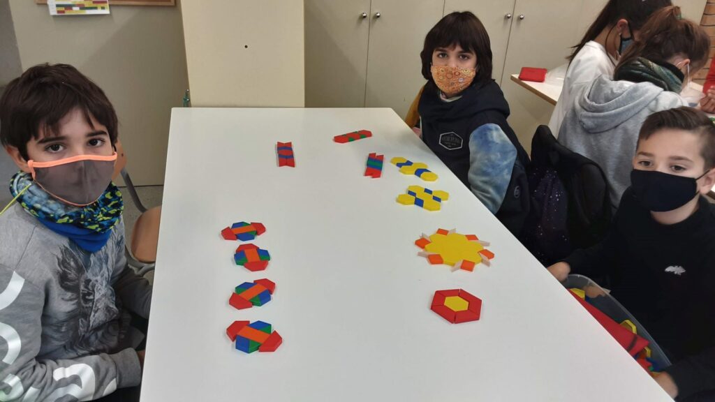 A matemàtiques hem treballat els polígons i hem experimentat amb blocs poligonals descobrint quines peces poden enrajolar i formar bonics mosaics. Ens han sortit unes creacions molt i molt xules que volem ensenyar.