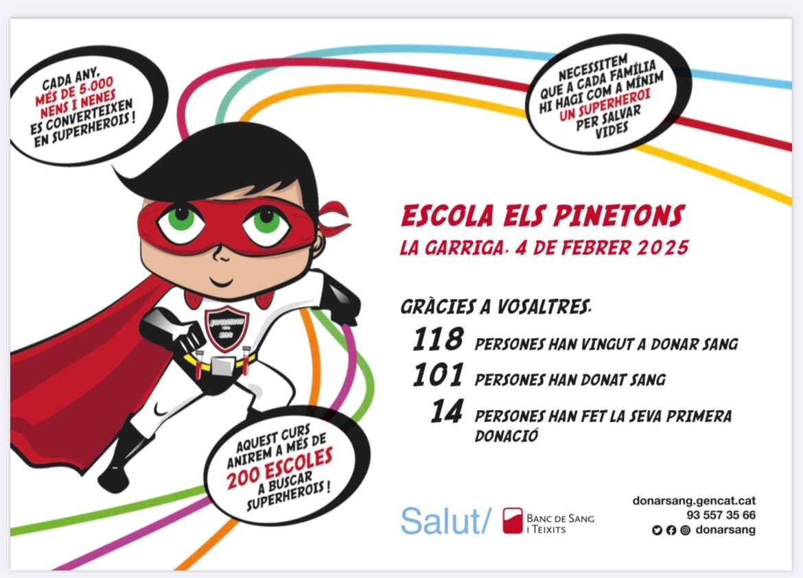 La jornada va ser intensa però molt ben organitzada. El resultat de la donació, un èxit: 101 donacions i 14 nous donants.  Aprofitem aquestes línies per agrair a tothom la seva dedicació per poder portar a terme aquesta magnífica iniciativa que ha quedat com un projecte consolidat a l’Escola Els Pinetons.  Gràcies a tothom! I recordeu que “Donar és estimar”.