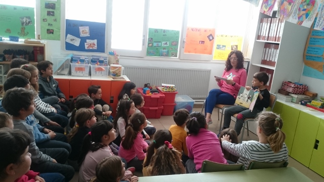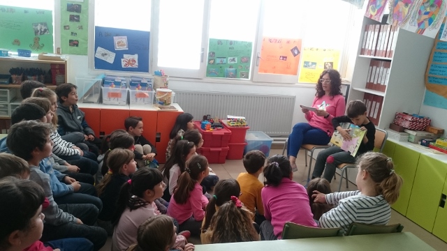 escoltant la lectura d’un conte.