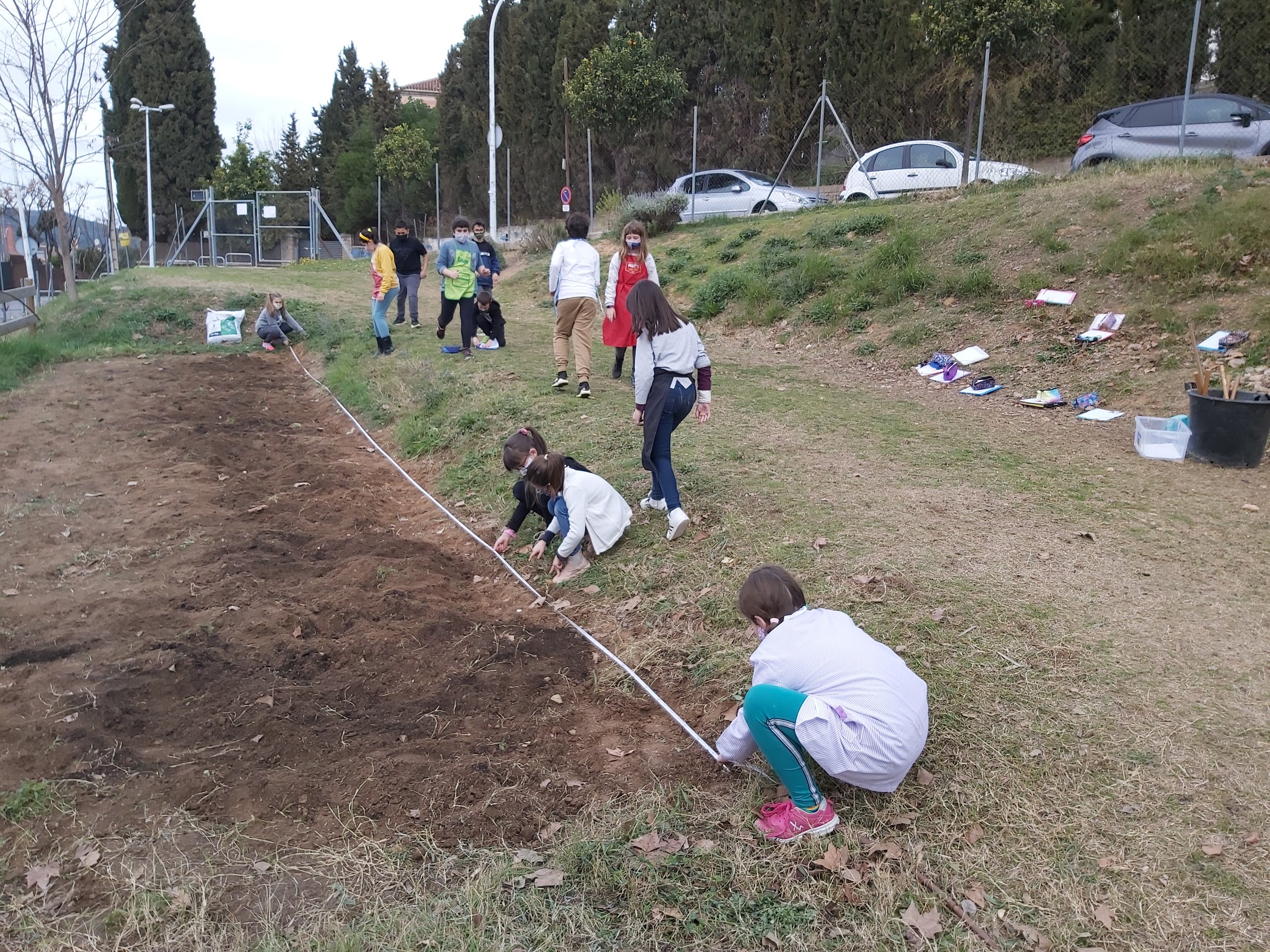 Alguns nens i nenes estàvem picant la terra amb les aixades i d’altres, amb les pales, removíem la terra, per estovar-la, ja que, quan plogués, l’aigua de pluja entrés amb facilitat. Era una feina xula, delicada, pesada i cansada. 🙂