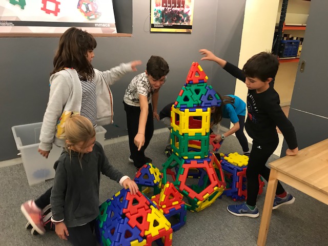 A la tarda hem entrat al museu de les matemàtiques. Hem fet una visita i una activitat. No us penseu que és un museu avorrit! Hem jugat a moltíssims jocs matemàtics molt divertits. Hem jugat amb un tangram gegant, hem fet construccions amb formes geomètriques grans, hem treballat simetries amb un mirall, hem parlar de la perspectiva i hem après a mirar edificis des de diferents punts de vista, sabeu que depenent de la perspectiva no sempre es veuen els mateixos edificis? Ens hem convertit en peces d’un laberint matemàtic!