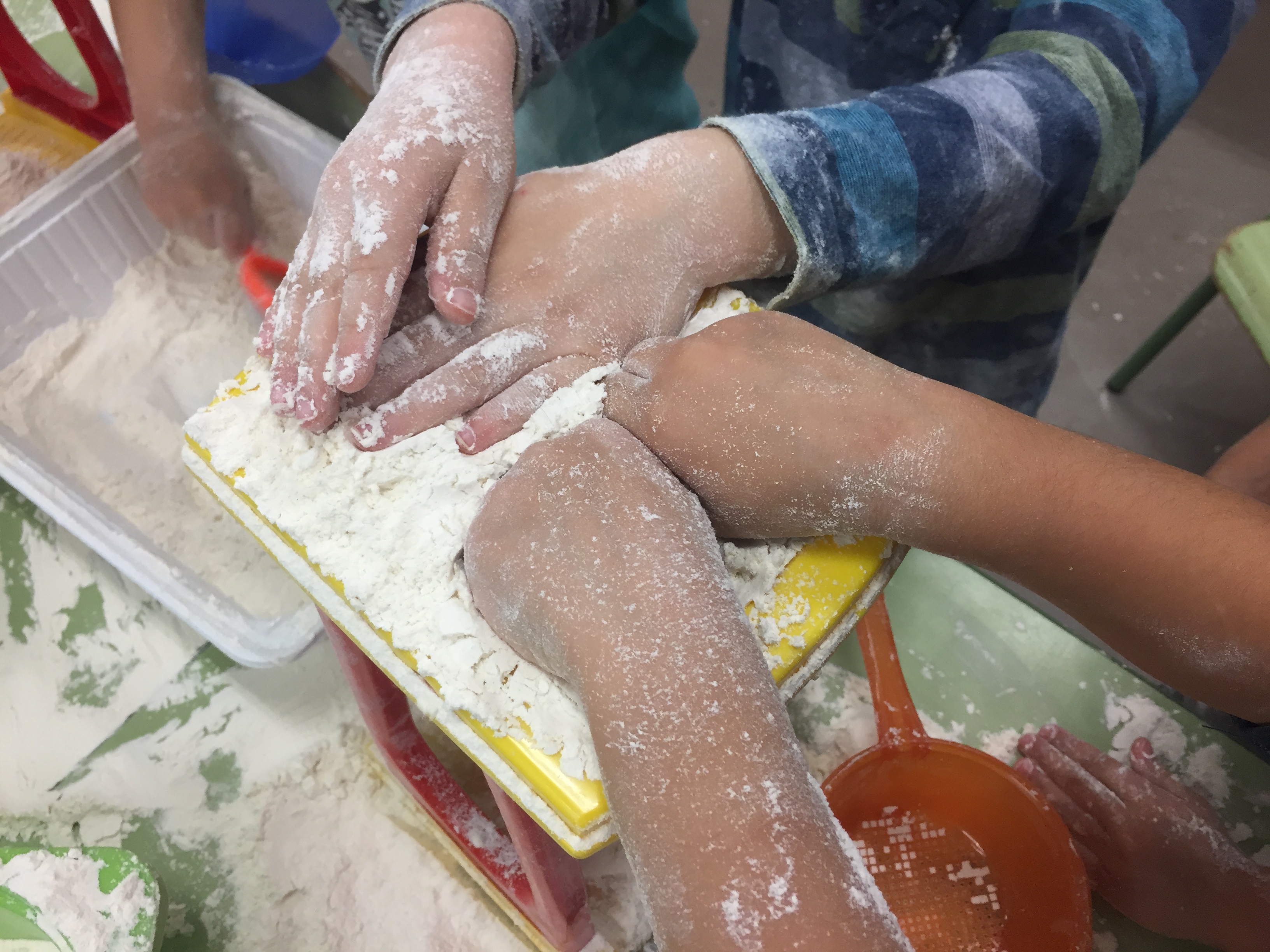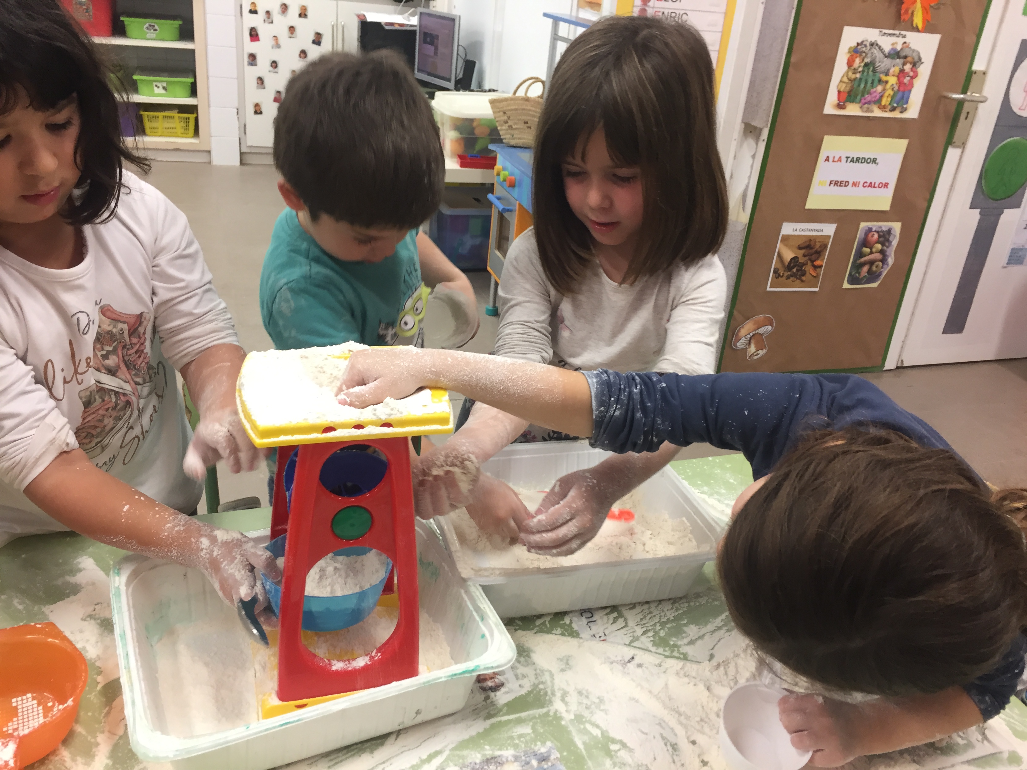 Ens ho hem passat d’allò més bé! A més hem descobert moltes coses: la suavitat de la farina, la diferència en com queia la farina i la sorra dins l’embut, i el soroll dels llegums mentre fèiem transvasaments amb pots, entre moltes altres.