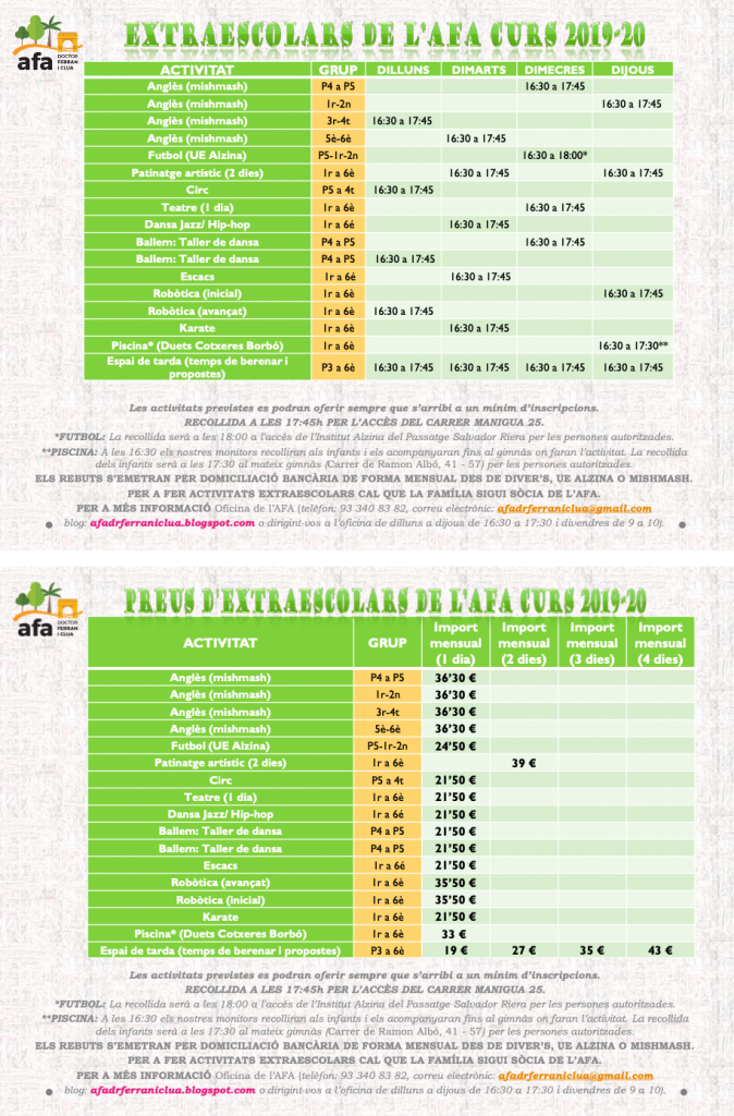 Us fem arribar el quadre definitiu d’activitats extraescolars, el podeu descarregar en aquest enllaç.