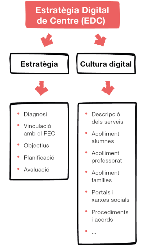 L’EDC és una estratègia transversal que es concreta en un document que pretén abastar tots els aspectes relacionats amb la cultura digital del centre. En aquest sentit, l’EDC ha de facilitar als centres la planificació i la gestió de tots els àmbits relacionats amb la cultura digital. També ha de permetre recollir i organitzar les accions que el centre ja realitza i replantejar-les i millorar-les per aconseguir els objectius que es proposi.