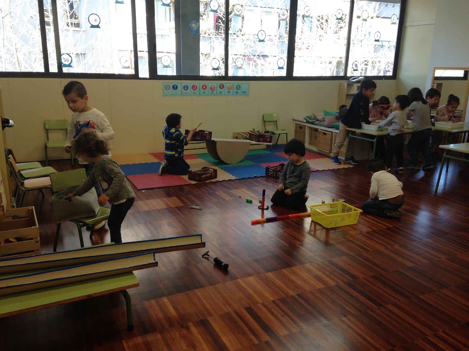 Els diferents grups de P4 i P5 es barregen i fan grups més petits per anar als diferents espais els dilluns i dimarts a la tarda: construccions, matemàtiques, art, experiments, natura, expressió i joc simbòlic. El torn de P3, també barrejats i en grups més reduïts, és els dimecres i dijous per fer: construccions, art, els cinc sentits, transvasaments i joc simbòlic. En comparació amb el curs passat, hem diferenciat els espais de P3 per donar una resposta més adequada a les necessitats d’aquesta franja d’edat.