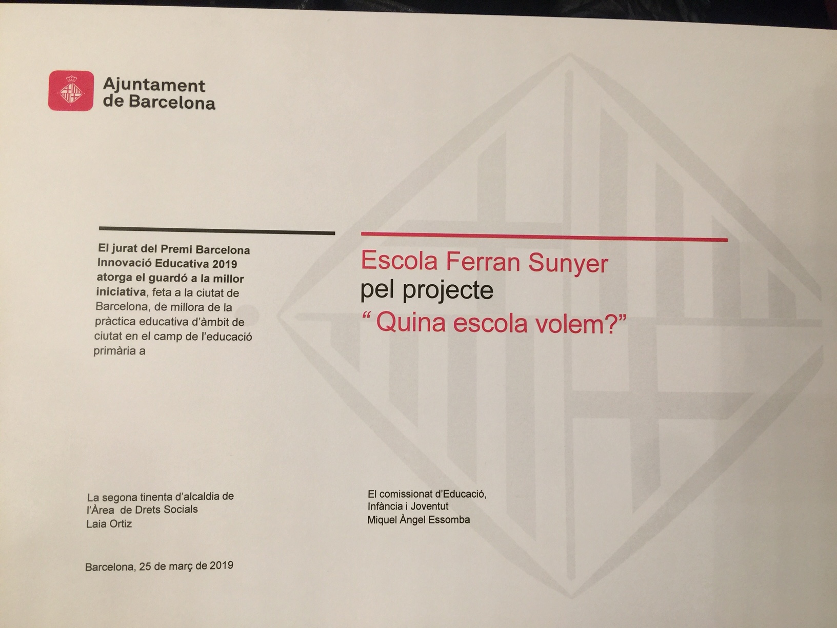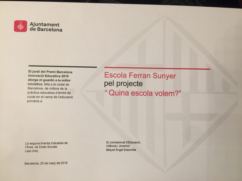 L’escola Ferran Sunyer ha estat guardonada amb un dels premis d’Innovació Educativa que entrega l’Ajuntament de Barcelona. En concret hem estat premiats en la categoria Ciutat – Educació Primària, pel projecte QUINA ESCOLA VOLEM?? que portem a terme amb la col·laboració de INUIT i destinat a donar veu a tots els membres de la comunitat educativa per dissenyar de manera conjunta l’escola que volem. Per tots i totes els que formem la comunitat de l’Escola Ferran Sunyer és motiu de satisfacció aquest reconeixement a la tasca que fem a l’escola en la recerca de millorar les nostres actuacions,