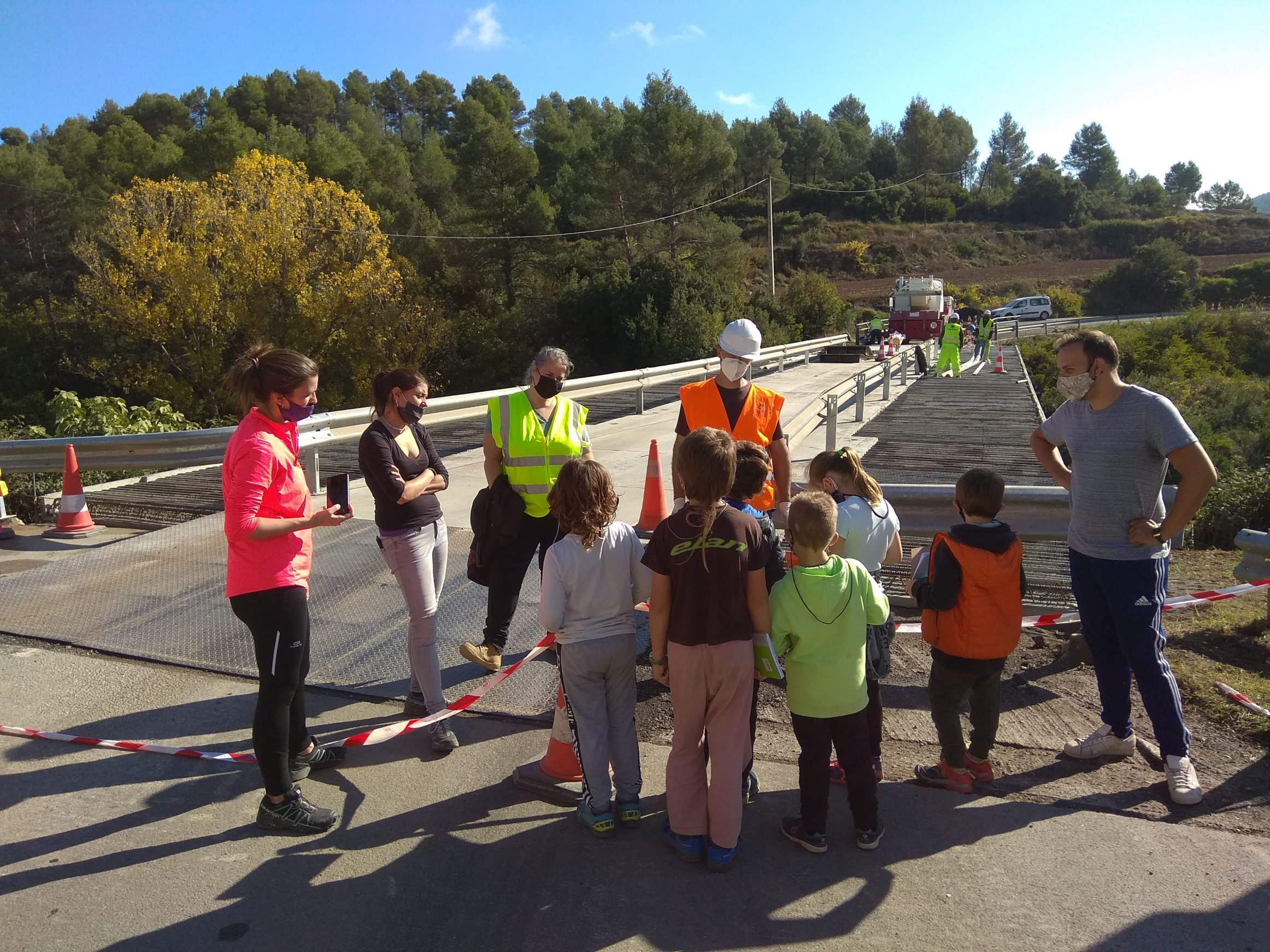 Avui divendres 23 d’octubre hem anat a visitar les obres que estan fent al pont del Raval del Paisà. La Directora de l’obra i el Cap de l’obra ens han atès molt amablement i ens han contestat les preguntes que els volíem fer. En grups de 6 hem pogut demanar-los per què estan fent les obres, com fan la ses soldadures sense electricitat, si és perillosa la feina que fan o si ja han fet obres semblants abans entre moltes d’altres preguntes. Quan hem tornat a l’escola, ens hem reunit a la pista i tots junts hem compartit les respostes que ens han donat. podeu veure imatges clicant AQUÍ.