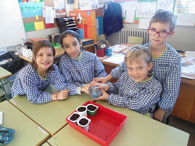 El primer que plantarem són cebes. Ara hem començat a preparar-les: hem ficat les llavors en pots petits perquè comencin a germinar.