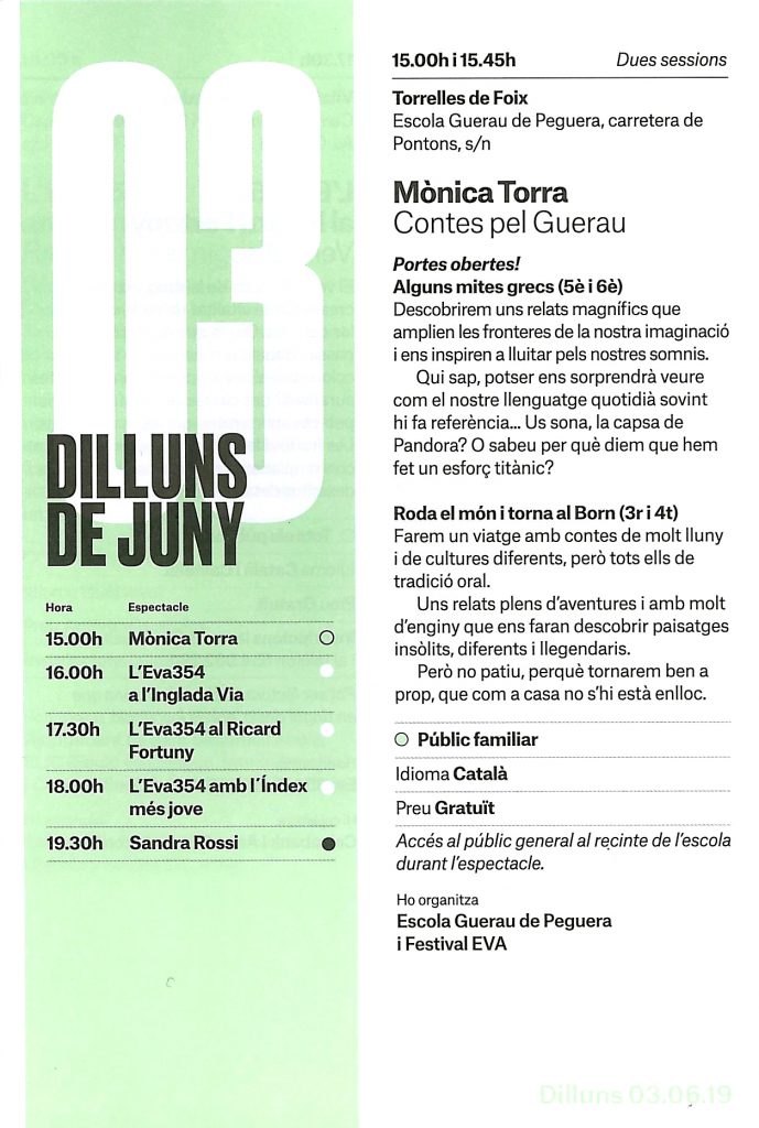 Una vegada més, l’organització del Festival “En Veu Alta” i la seva directora Jordina Biosca, just quan fa 15 anys de la iniciativa, aposten per portar un espectacle a l’escola Guerau de Peguera. Durant tot el curs, la Jordina ha fet que la narració i la tradició oral fos present a moltes hores de lectura i biblioteca. Podeu veure més amunt la proposta de la Mònica Torra “Contes pel Guerau” per dilluns vinent, 3 de juny, a partir de les 15 h. L’espectacle és obert a tothom.