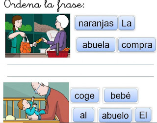 En la tercera página encontramos palabras que bien ordenadas hacen una frase que explica el dibujo que hay a su lado.