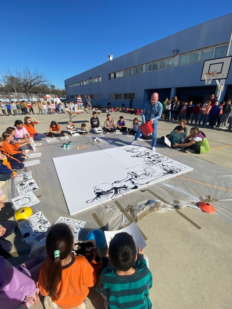 A la tarda, s’ha viscut un dels moments més especials de la jornada. Tot l’alumnat i el conjunt de docents s’han reunit per compartir una sessió artística conjunta. A partir d’alguns dels dibuixos realitzats durant el matí per l’alumnat, en David Callau s’ha inspirat per crear una obra pictòrica en directe.