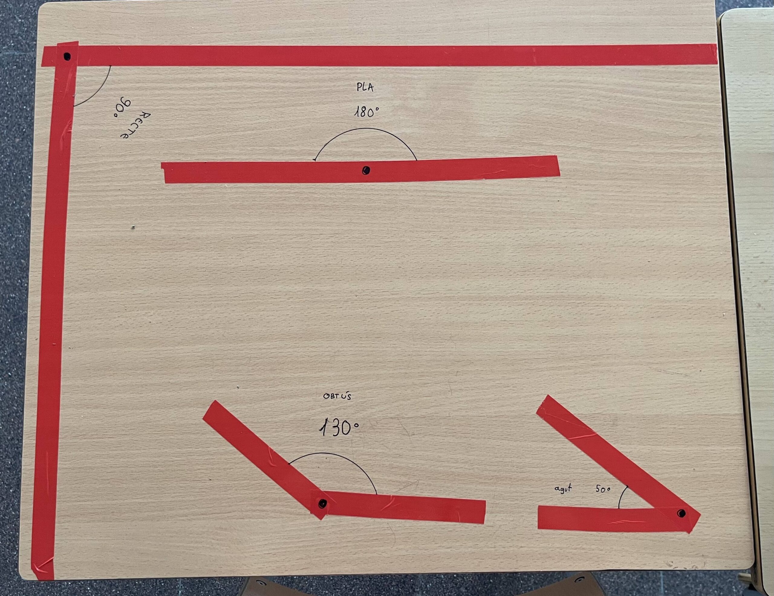 Avui a la classe de matemàtiques, hem après a treballar amb els angles d’una manera molt visual i pràctica. En lloc de fer-ho només amb llapis i paper, hem utilitzat un material molt original: cintes adhesives de colors!
