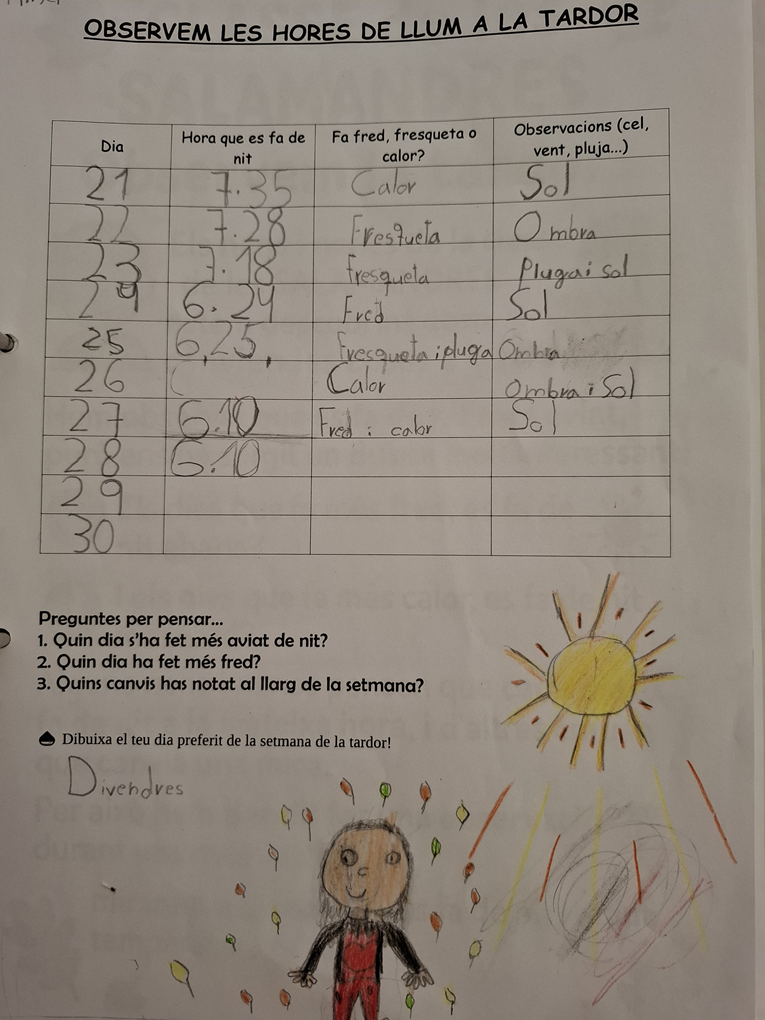 Ens van sorgir dues lĂnies dâinvestigaciĂł: per què cauen fulles i per què cada dia es fa fosc una mica mĂŠs aviat. Hem estat observant, experimentant, anotant i fent hipòtesis, com fan els investigadors de veritat!