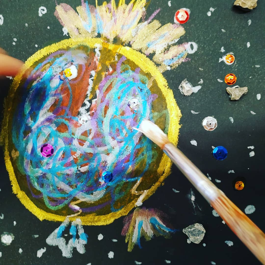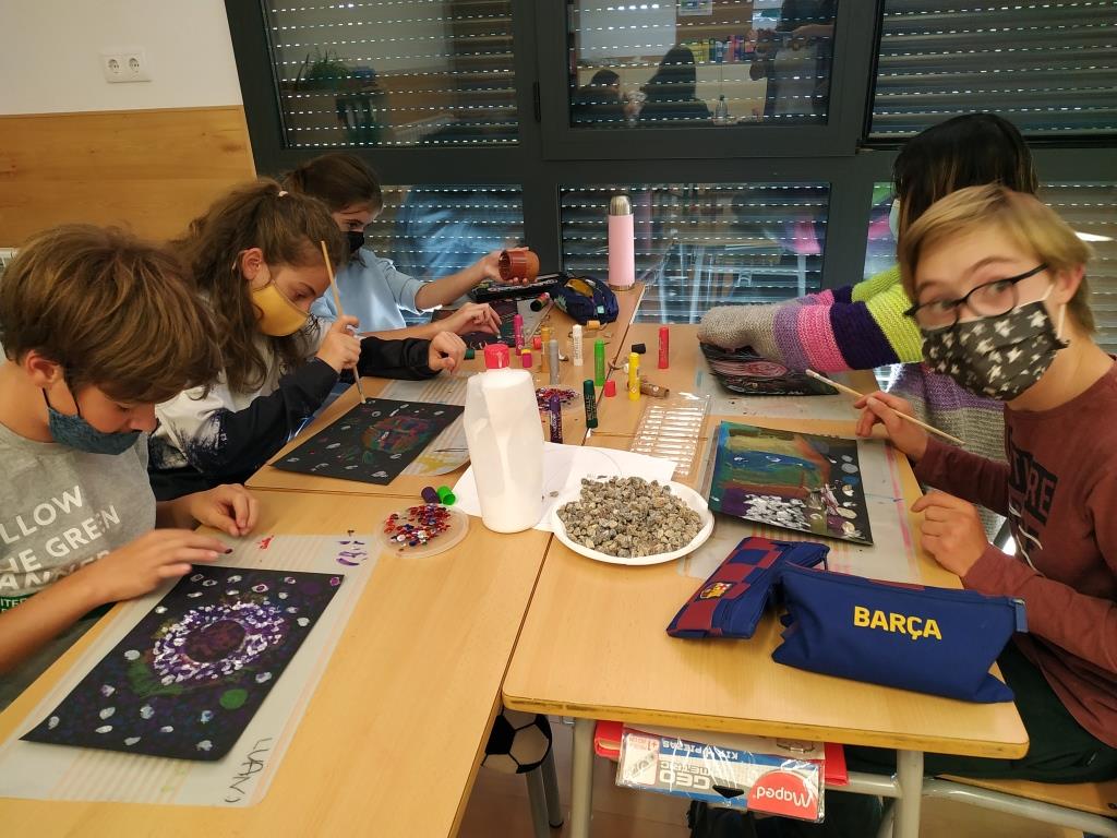 Primer ho vam imaginar plàsticament, fent dibuixos amb ceres i collage d’altres objectes sobre cartolina negre. Després vam provar d’explicar les nostres versions: