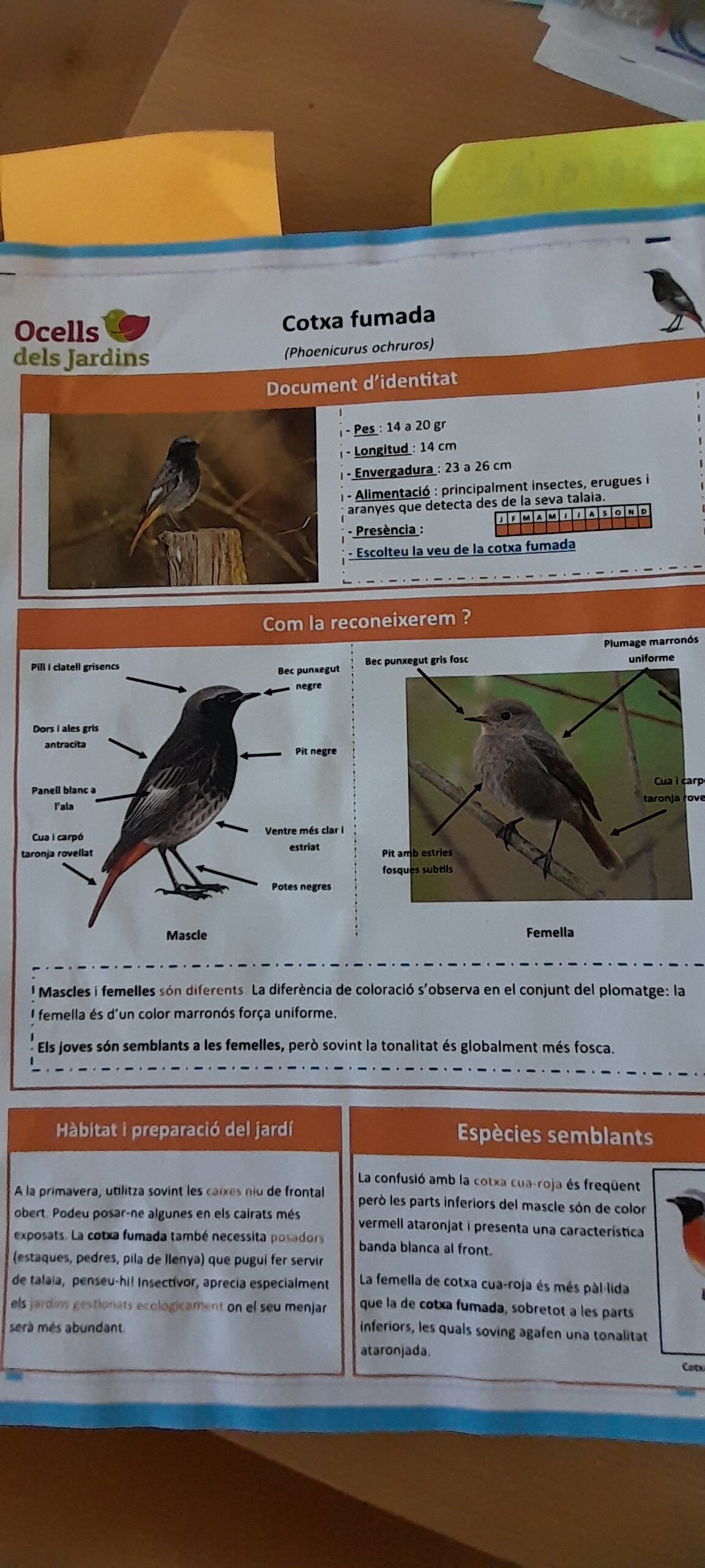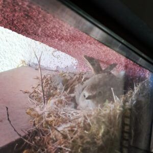 Fa uns dies, us vam compartir que un ocell havia fet niu en una de les finestres de l’aula de Cicle Superior. Vam estar-lo observant, i per la seva fisonomia…després de fer recerca d’informació vam trobar que es tractava d’una cotxa fumada.