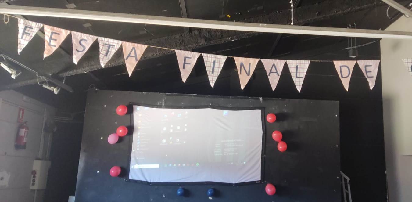 Tota la comunitat educativa, alumnes, mestres i famílies, ens vam reunir al teatre per iniciar la festa que amb molta il·lusió havíem preparat. L’escenari estava decorat amb objectes de la platja per fer una bona entrada a l’estiu.