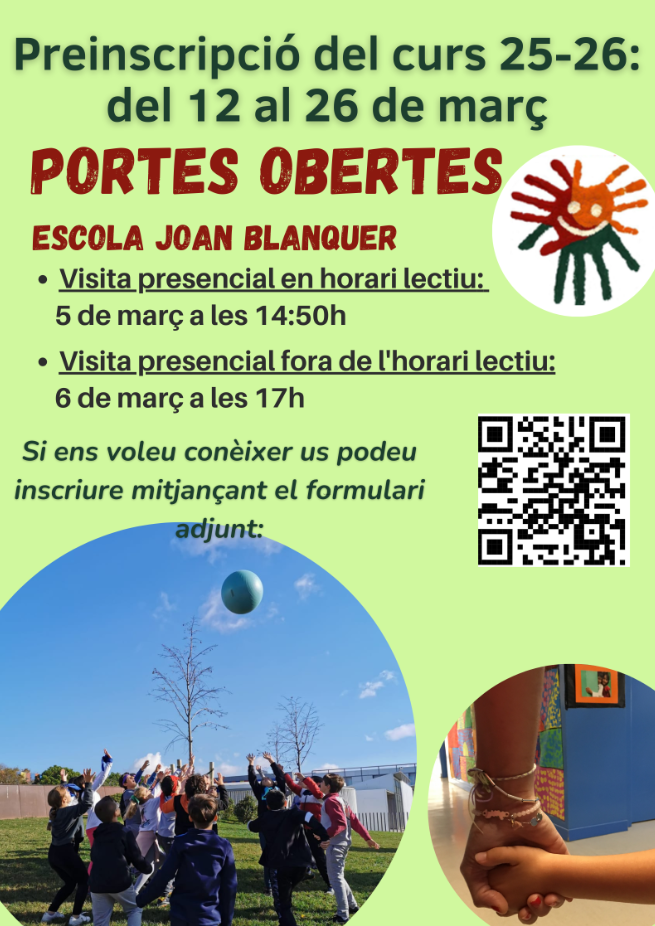 PORTES OBERTES CURS 2025-2026 Escola Joan Blanquer04/02/25 Confirmació d’assistència: Cliqueu per omplir el formulari d’inscripció.