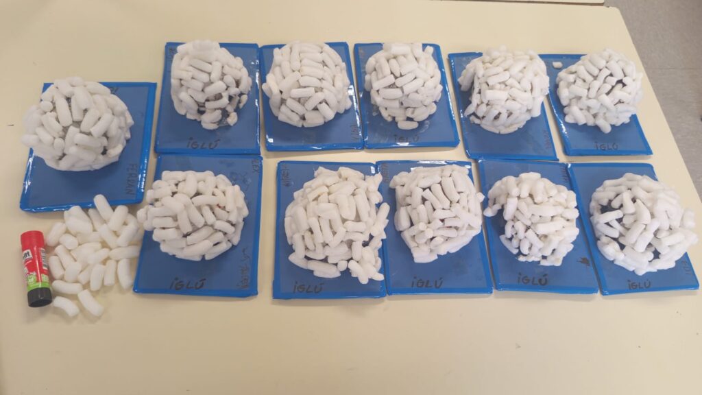 Hem fet una escultura de “gel”, un iglú, amb peces de blat de moro blanc (play mais).