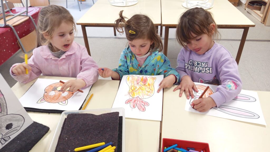 A l’aula d’art ens preparem pel Carnaval i pintem unes màscares d’animals de granja i domèstics. Poden triar un conill, gos, gat, gall o porc. El pinten amb “plastidecors”, el punxen seguint el contorn i buidant els ulls. Es plastifica i s’hi afegeix la goma elàstica. I ja estan a punt per una disfressa ben animal!