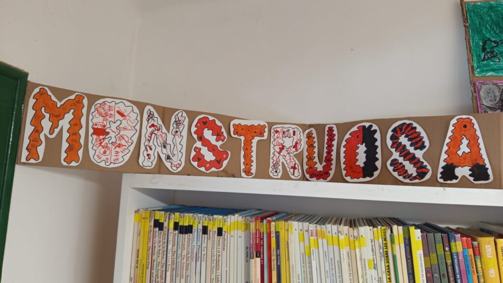També vam decorar la biblioteca. Ja teníem els monstres posats en cartrons que estaven a dalt de les lleixes dels llibres, vam fer monstres amb plastilina i els vam posar tots junts en un moble i també van anar fent dibuixos de por: fantasmes, rat-penats, carbasses de Halloween, ganivets… van gaudir molt.