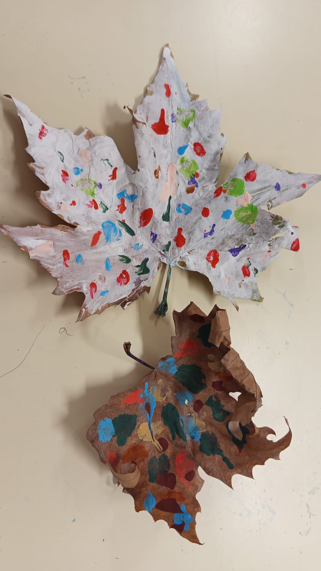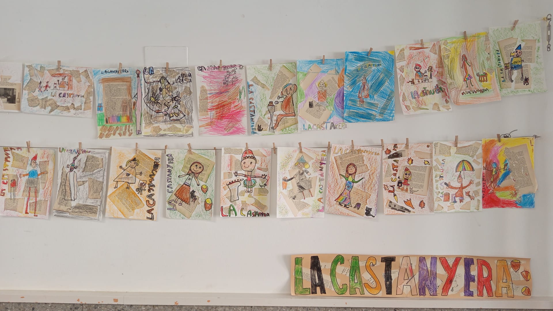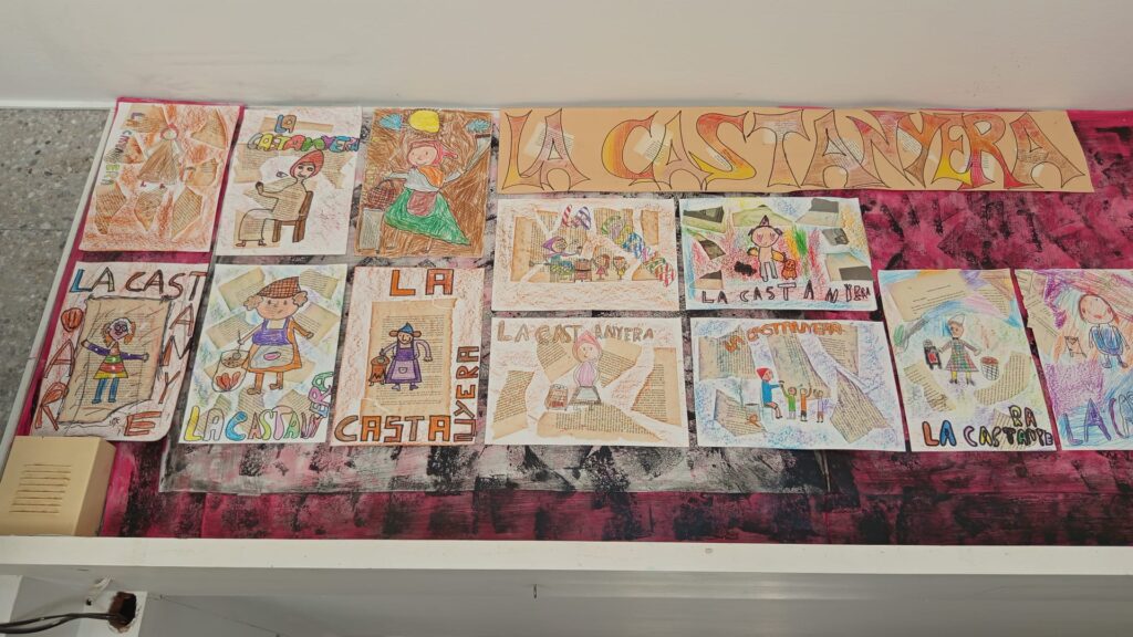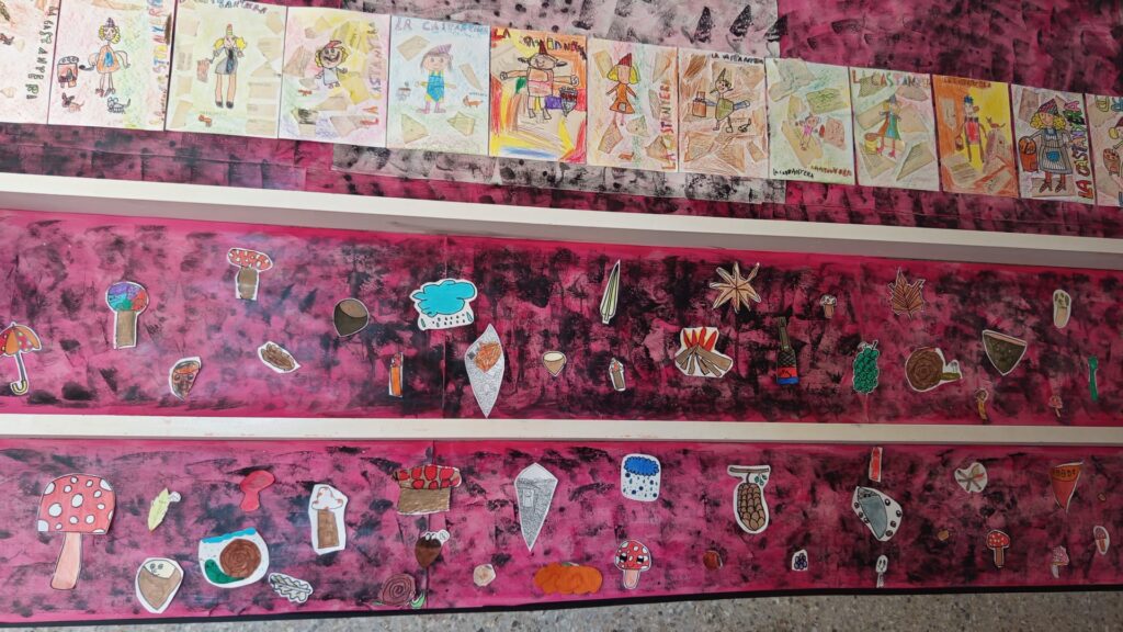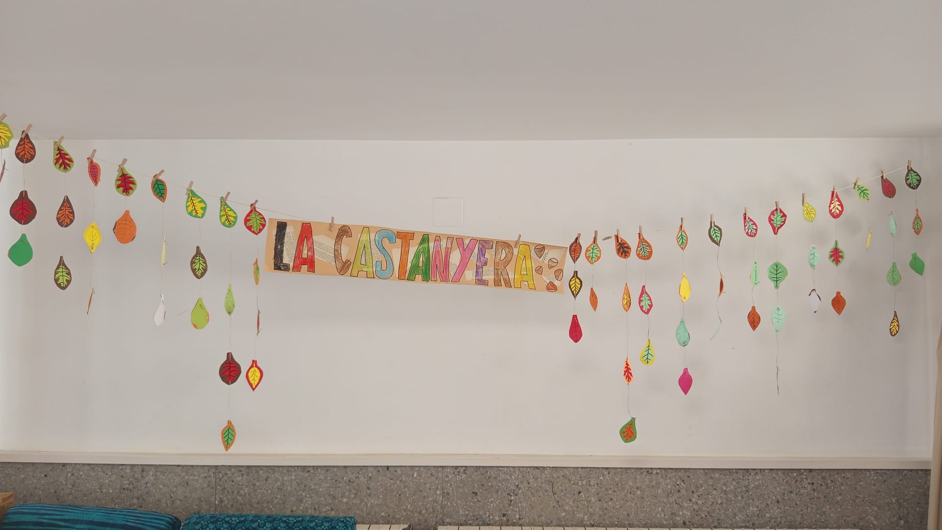 Vam dibuixar la castanyera, sobre un fons amb fulls esquinçats d’un llibre vell. Cadascú la va fer a la seva manera, pintat tot amb “plastidecors”. Van quedar totes fantàstiques i posades al hall, amb fulles de tardor penjades i elements de la tardor, han quedat molt divertides. Alguns també van tenir temps de pintar fulles seques del pati amb tèmperes.