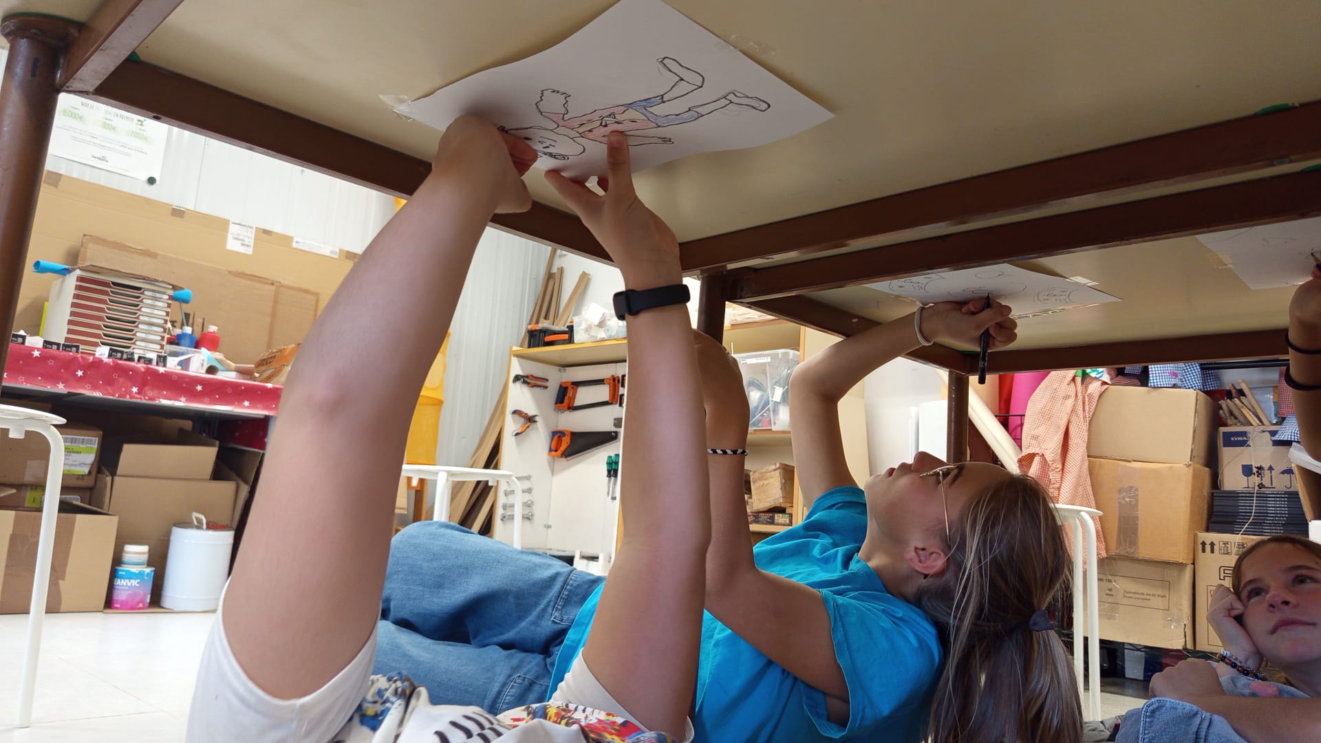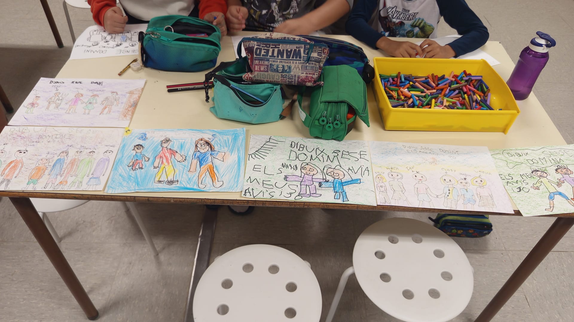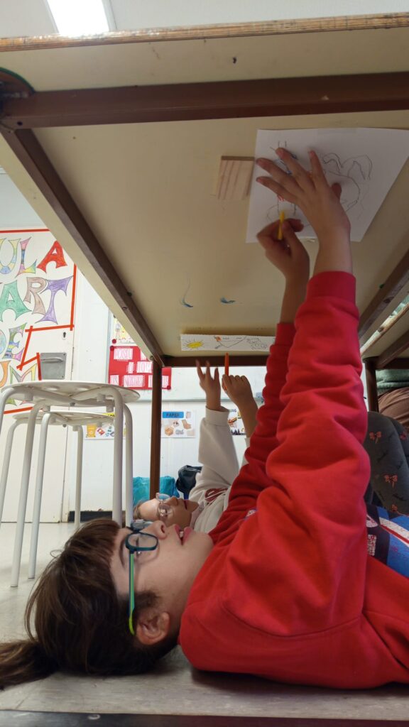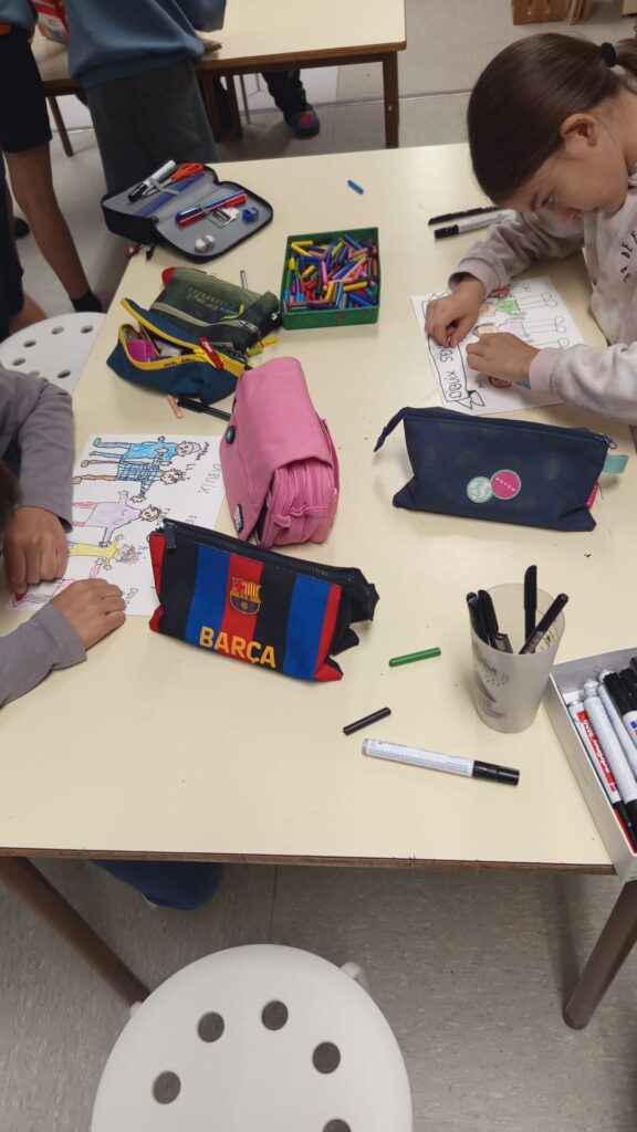 Aprofitant que treballem la Setmana de la Gent Gran, hem fet els tallers mirant les dificultats que es troben les persones a mida que van fent anys i hem fet un dibuix nostre amb els nostres avis amb la mà no dominant. Els que han acabat, també han pogut fer un dibuix a sota la taula o un dibuix de caps per avall, al revés.