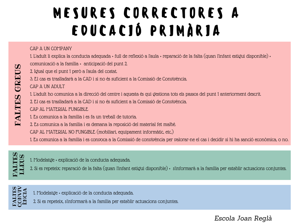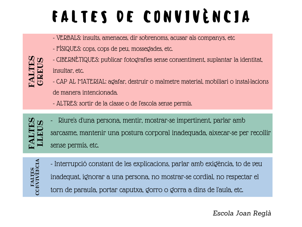 El procés educatiu necessita ser dut a terme en un clima de convivència que afavoreixi l’aprenentatge. Amb aquesta finalitat, l’escola acorda aplicar, dins i fora el recinte escolar, en activitats lectives i extraescolars, les següents normes de convivència:
