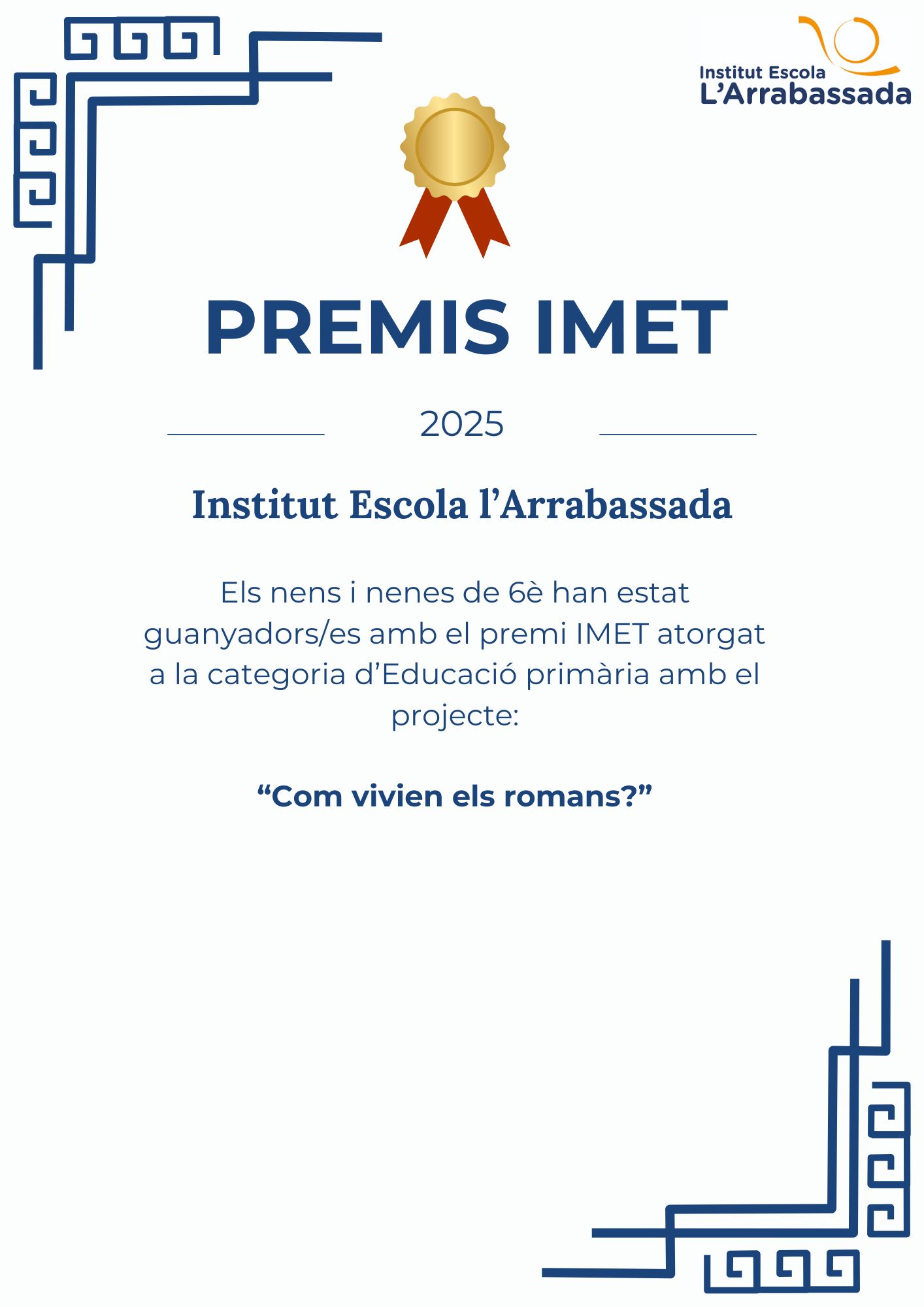 Com vivien els romans? Feu un comentari / Per admin / 26 de novembre de 2025 / 6è General Portada / IMET, romans L’alumnat de 6è de primària ha guanyat el Premi IMET d’educació a la categoria de primària amb el projecte que van treballar el curs passat: Com vivien els romans? Enhorabona!