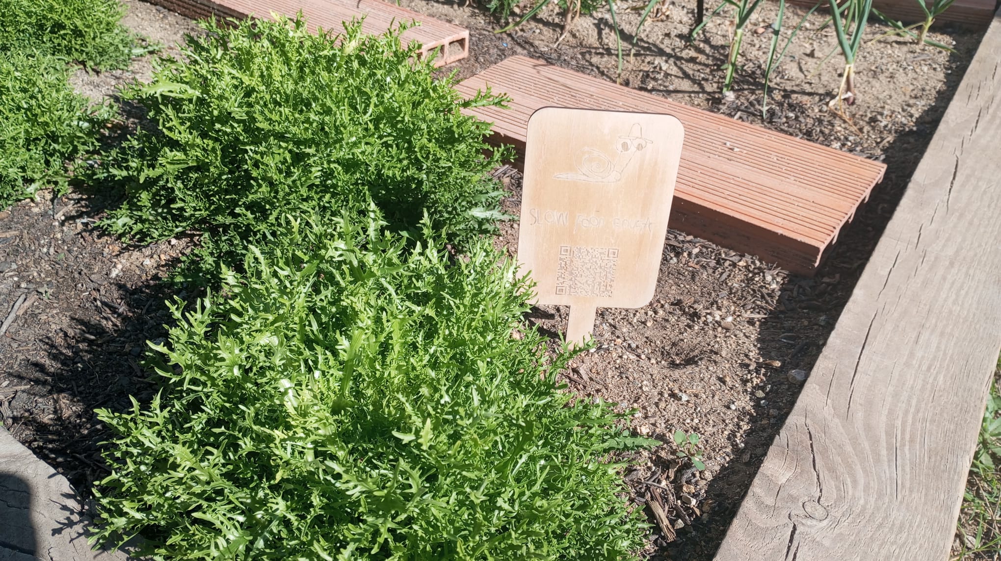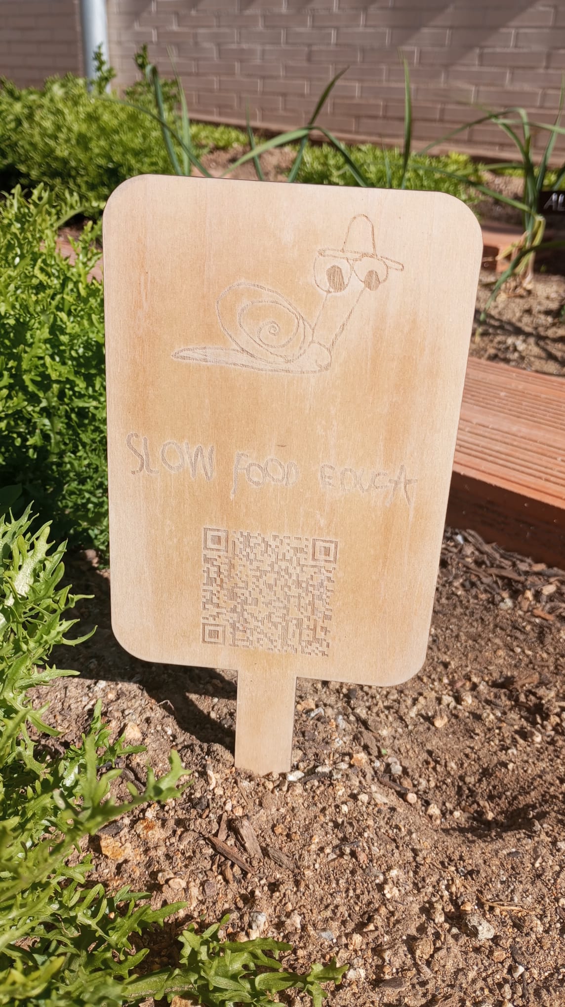 Vam dissenyar el nostre logo “Slow” i amb la talladora làser vam crear el cartell que trobareu a l’hort. Si escanegeu el codi QR podreu conèixer el porjecte.