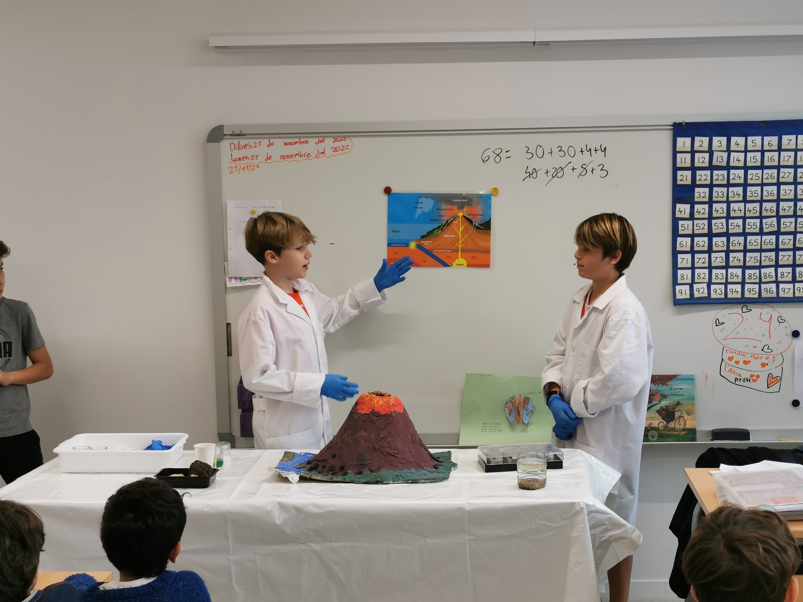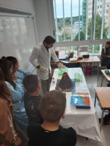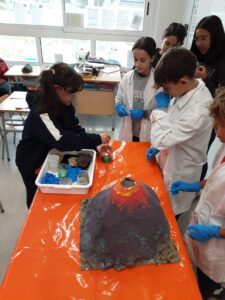 El passat dilluns 21 de novembre, els i les alumnes de 1r d’ESO van visitar a l’alumnat de l’escola amb motiu de la Setmana de la Ciència. Al llarg de la jornada, els nens i nenes de la comunitat dels grans (3r a 6è) van gaudir d’un seguit d’experiments junt amb una explicació liderada per la comunitat de joves (1r ESO). Va ser un dia ple d’aventures descobrint les diferents capes de la terra, erupcionant un volcà i recreant un tsunami!