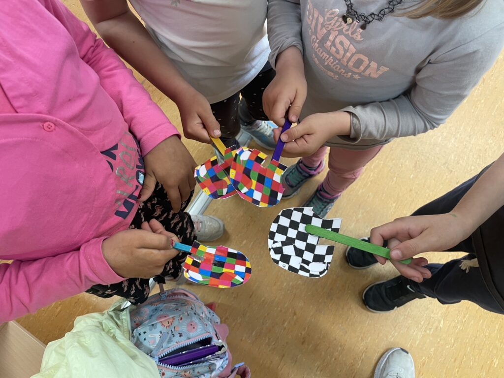 Hem començat amb l’aventura de l’Elmer i el seu cosí Wilbur, que l’han gaudit els nens i nenes de primer de primària. S’ho han passat d’allò més bé amb els dos elefantets! Després, han muntat una titella dels protagonistes. I fins i tot, han tingut temps de començar a fer una ullada d’altres llibres sobre animals.