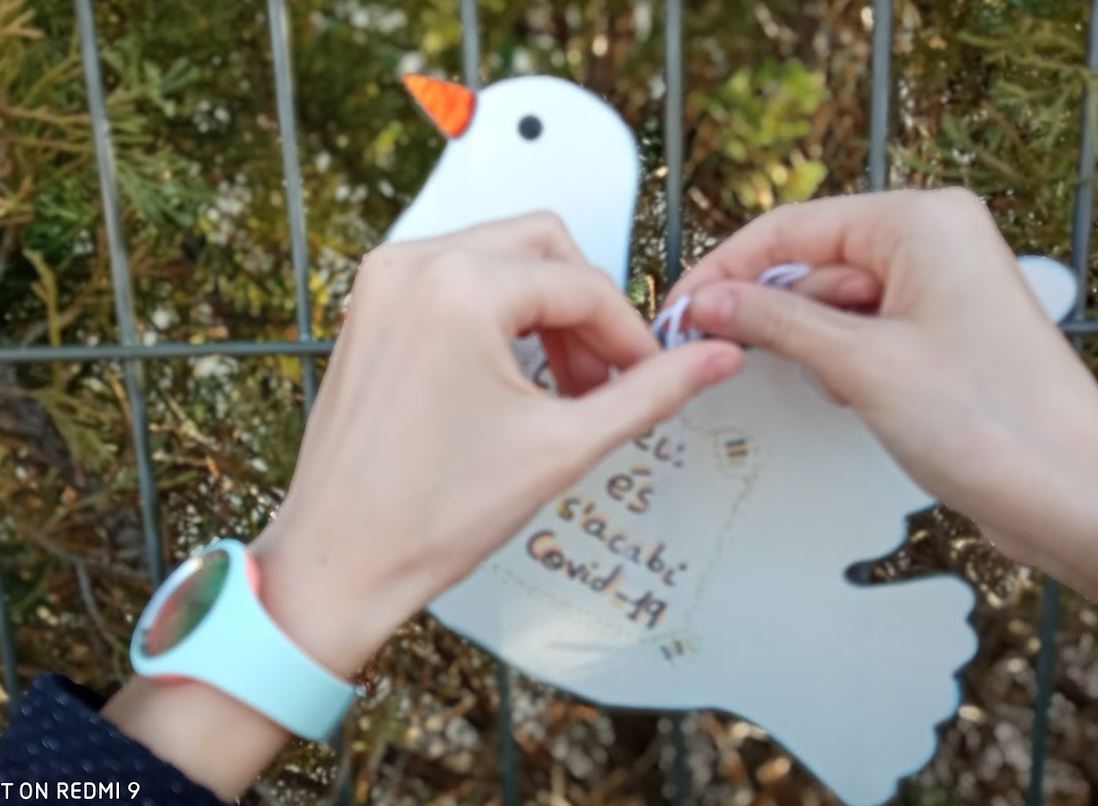 En vam parlar a classe i simbòlicament vam penjar diversos coloms (símol internacional de la Pau) a la tanca de l’escola per tal que transportessin els nostres desitjos de pau.
