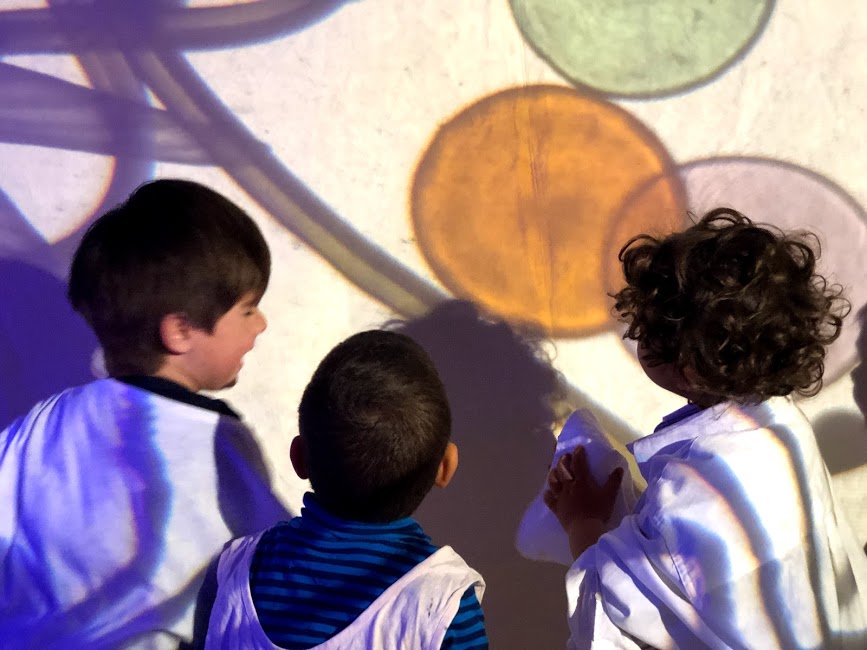 Per què li diem “laboratori” i no “aula”? Perquè aquesta no és una aula qualsevol, aquest espai és fosc, màgic, juguem, aprenem, fem jocs d’ombres de colors, escrivim amb colors brillants, creem i composem imatges, dibuixem amb la llum, descobrim textures, treballem… Fem ciència!