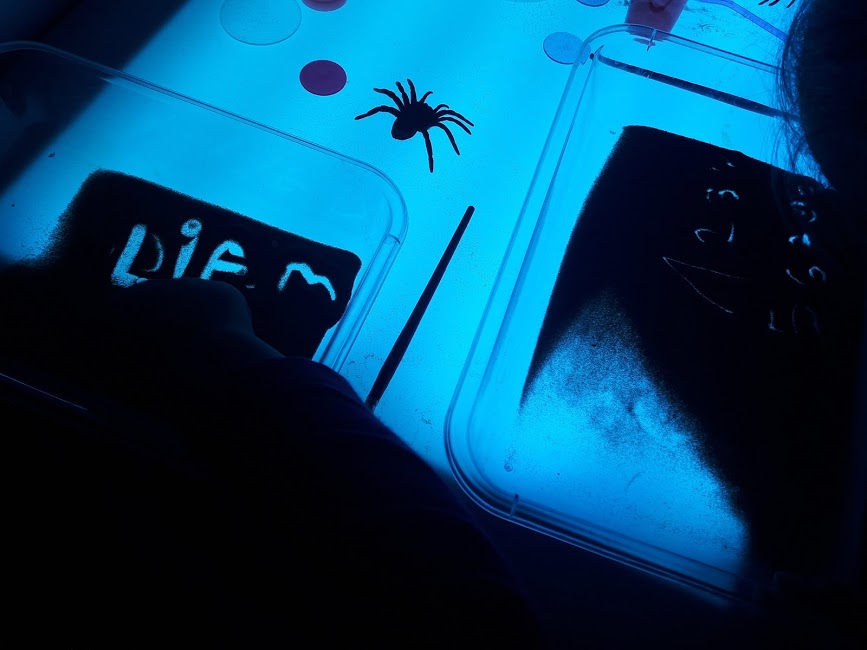 Aprofitem els desdoblaments de psicomotricitat per poder venir quinzenalment a jugar amb la llum en petit grup. En aquesta aula hi trobem diferents propostes que anem canviant cada setmana perquè sigui més motivador tot plegat.