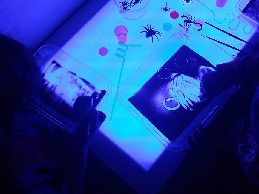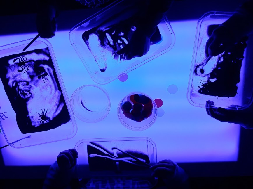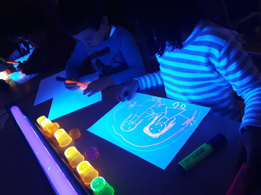Dibuixar a la sorra de platja, fer grafismes lliures sobre sorra de taronjas o llimones, utilizar rotuladors que brillen, construir a les fosques, fer ombres de colors, jugar amb miralls, fer barreges de colors a l’aigua, observar flors i fulles sobre la taula de llum, fer seriacions que brillen, treballar el nostre nom, projectar objectes sobre nostre …