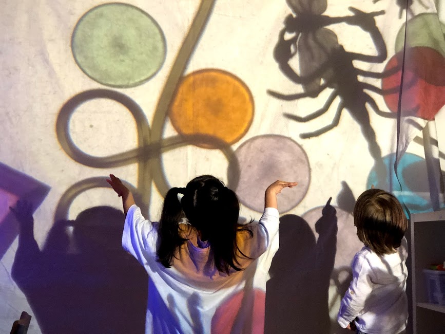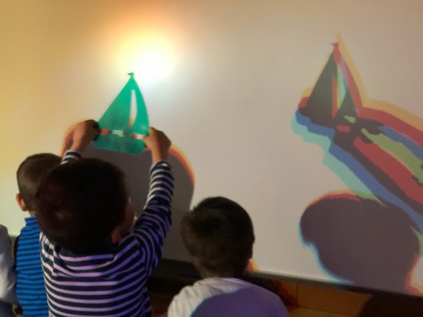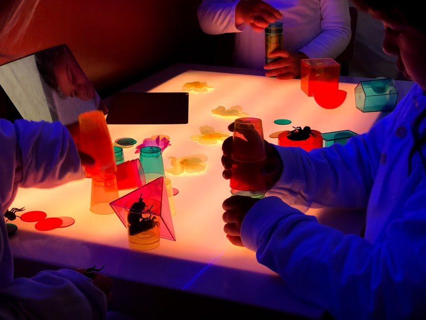 Des del joc amb les ombres fins a l’experimentació amb els materials més sofisticats, els infants investiguen les propietats de la llum i del color, es fan hipòtesis i comproven els resultats. Les seves cares són de fascinació al entrar a aquesta aula, es meravellen per les ombres, o pels reflexes del sol… i ja no cal esmentar la festa que fan quan es descobreix un Arc de Sant Martí que es reflexa per la finestra i decora el terra.