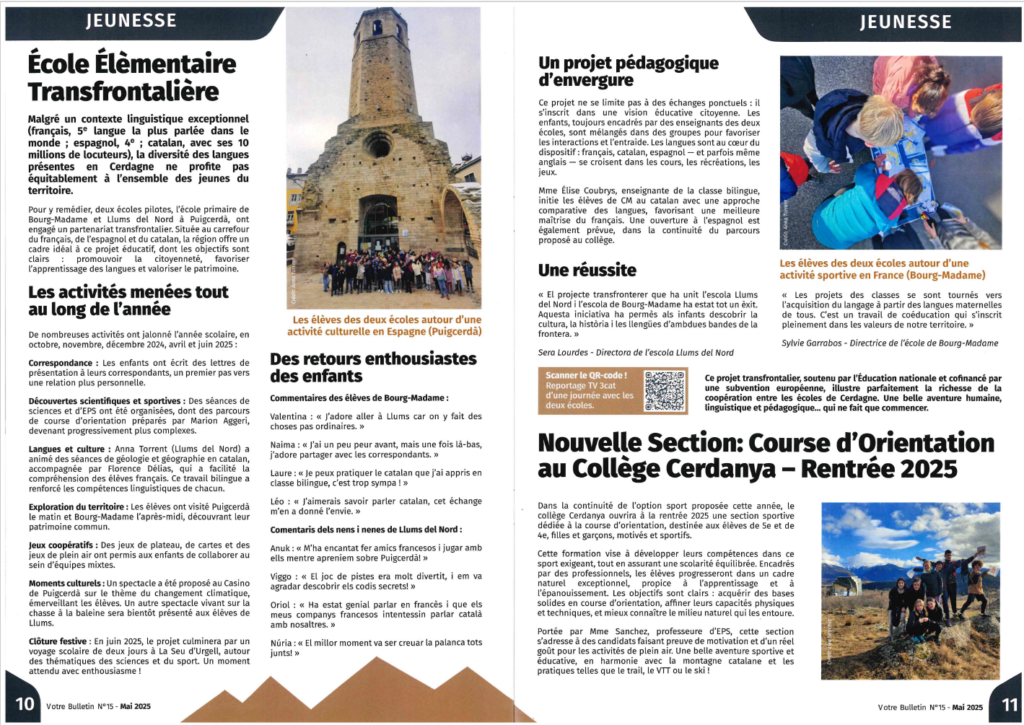 Estem molt contents de compartir que el nostre projecte transfronterer d’aquest curs ha estat publicat al Votre Bulletin Bourg-Madame, Caldegas, Hix, Onzés, la revista que recull les activitats dels pobles veïns. Una experiència enriquidora que connecta cultures i fomenta l’aprenentatge compartit entre escoles!