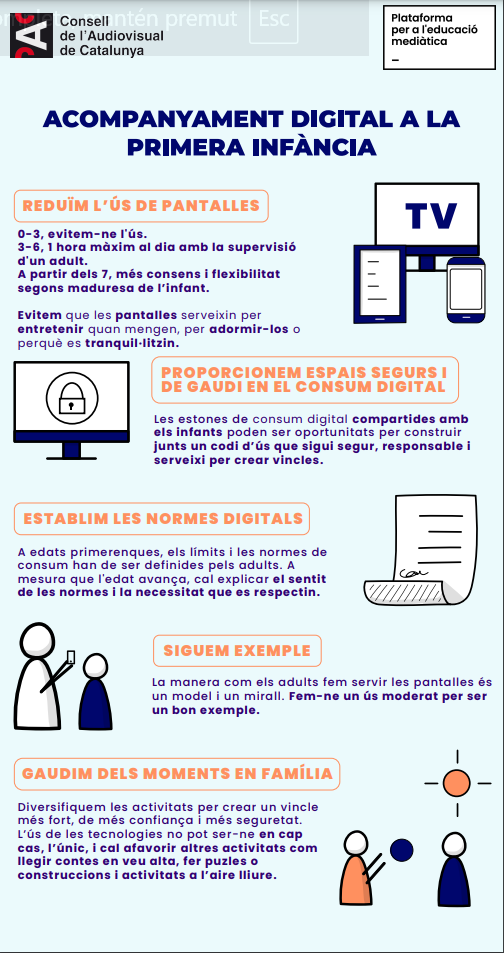 A l’escola treballem per fomentar una educació mediàtica que prepari els infants i joves per ser usuaris crítics, creatius i responsables. Tanmateix, la vostra implicació com a famílies és essencial per reforçar aquests aprenentatges a casa.