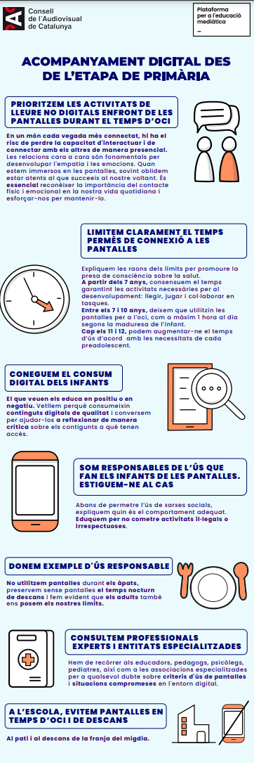 A la nostra escola creiem fermament en la importància de treballar conjuntament amb les famílies per fomentar un ús saludable i responsable de les pantalles des de la primera infància fins a l’edat adulta. És per això que compartim amb vosaltres un conjunt de recomanacions elaborades per la Plataforma per a l’Educació Mediàtica (PEM) i el Consell Audiovisual de Catalunya (CAC), amb l’objectiu de promoure hàbits digitals saludables en tots els àmbits de la vida.