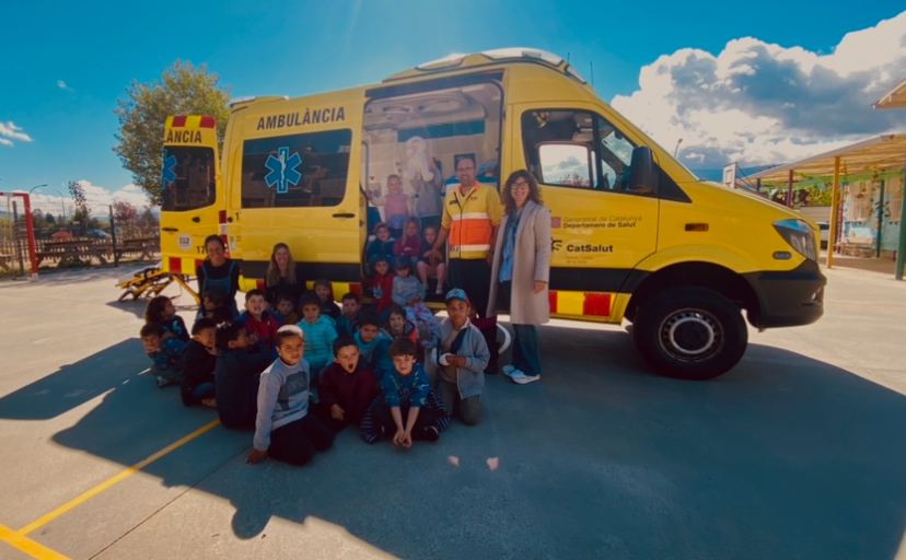 TAMBÉ HEM PUJAT A DINS L’AMBULÀNCIA, ENS HEM ESTIRAT A LA LLITERA, ENS HAN EXPLICAT PERQUÈ LES LLETRES ESTAN AL REVÉS, I PERQUÈ PORTEN UNA ROBA DE COLOR TAN LLAMPANT, HEM ESCOLTAT EL COR, HEM VIST MOLTS LOGOS… I ENS HAN REGALAT UNA AMBULÀNCIA PER MUNTAR I UNA GORRA!