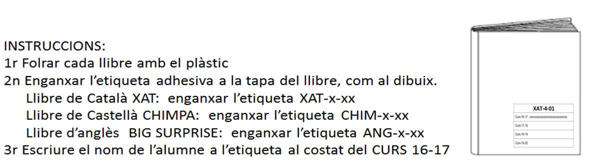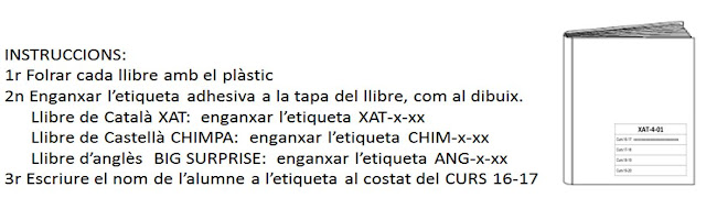 El dia 14 de juliol, quan vingueu a entregar els comprovants dels pagaments us entregarem els tres llibres, el folre, les etiquetes i les instruccions perquè cadascú prepari els seus llibres.