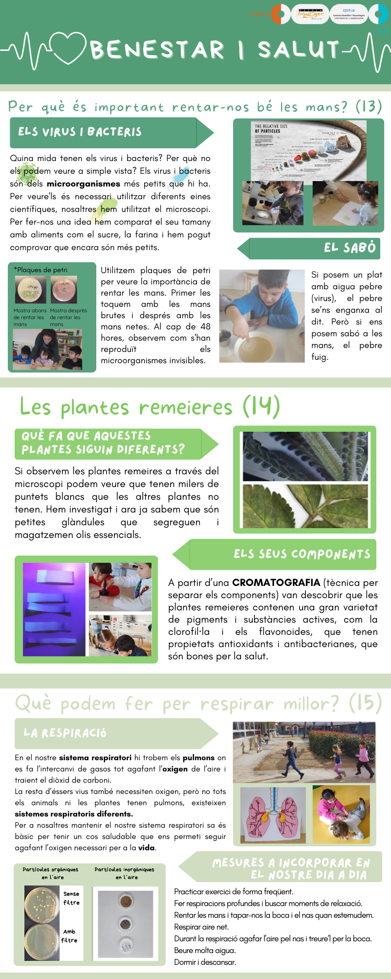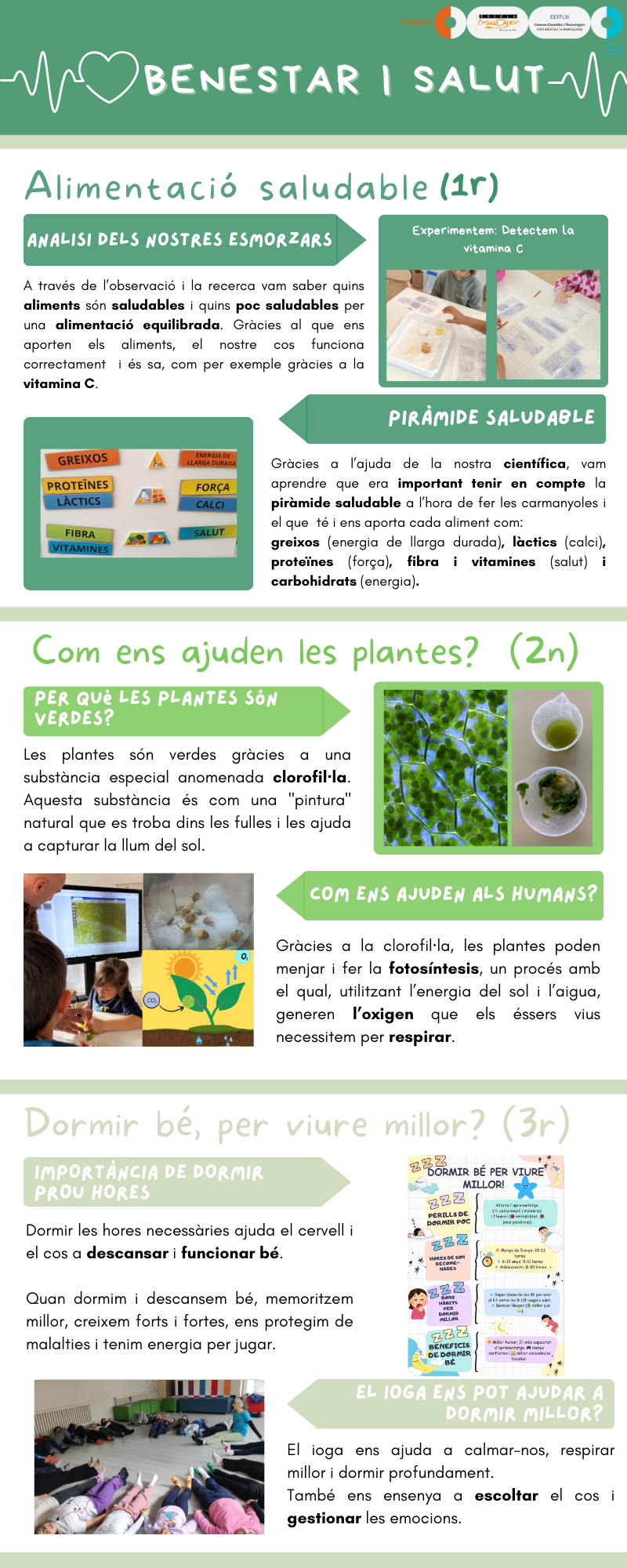 A l’aula, vam investigar més sobre la clorofil·la i vam descobrir que serveix per fer una cosa molt important: la fotosíntesi. Gràcies a aquest procés, les plantes poden fabricar el seu propi aliment a partir de llum solar, aigua i diòxid de carboni. I, a més, produeixen oxigen, que és essencial perquè les persones puguem respirar. Les plantes, per tant, netegen l’aire i ens ajuden a estar sans!