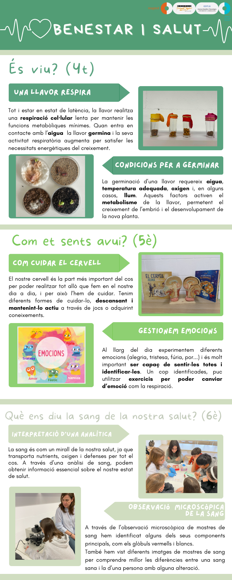 Després ens vam preguntar: què mengen les plantes?, per què són verdes? Això ens va portar a fer una sortida al camp per observar-les de prop. Allà vam veure que gairebé totes les plantes són verdes. A l’aula vam descobrir que això és per un pigment que tenen a les fulles: la clorofil·la.