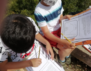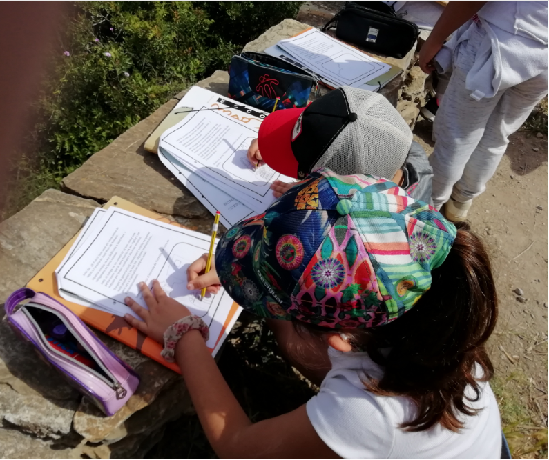 Ens hem aturat a una pineda on hi havia molta ombra i hem dibuixat les fulles del pi . També hem agafat un full i l’hem col·locat a sobre de l’escorça del pi i l’hem arrossegat i màgia, s’ha calcat la seva forma!