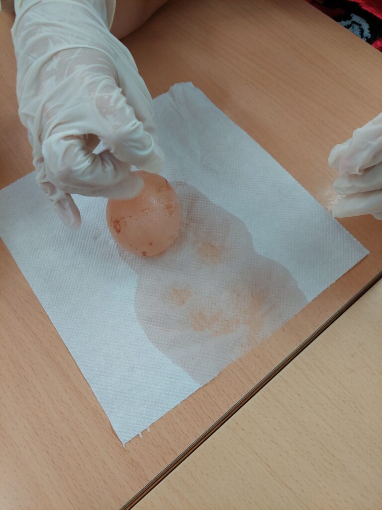 El primer experiment, consisteix en ficar un ou en vinagre i deixar-lo una setmana, un cop ha passat aquest temps, han tret l’ou del vinagre i el més sorprenent és que rebota i no es trenca.